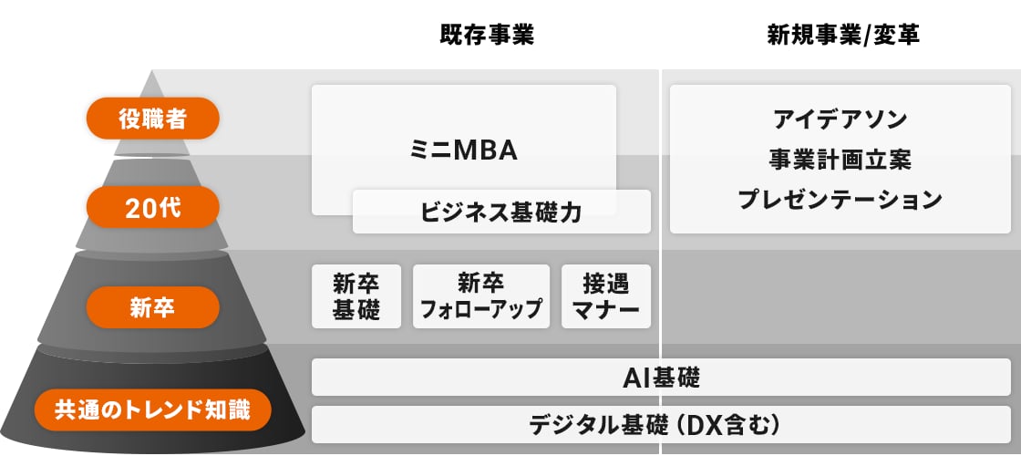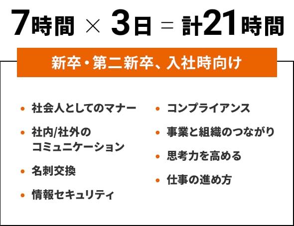 社会人としての基本マナーから、仕事の進め方・思考力までを体系的に身につける新入社員向け研修(第二新卒~30歳くらいまで受講可)。Udemyで評価4.5 の新入社員向け講座を活用。コミュニケーション・情報セキュリティ・コンプライアンスといった基礎知識に加え、事業と組織のつながりを理解することで、自身の日々の仕事と会社組織とのつながりを習得。現場で即必要な内容を網羅し、自走できる社会人への第一歩を踏み出すことができます。