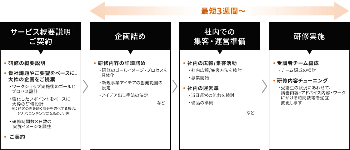 「新規事業」「企業変革」特化型で、個社別の課題にあわせてカスタマイズし企画・提供しています。