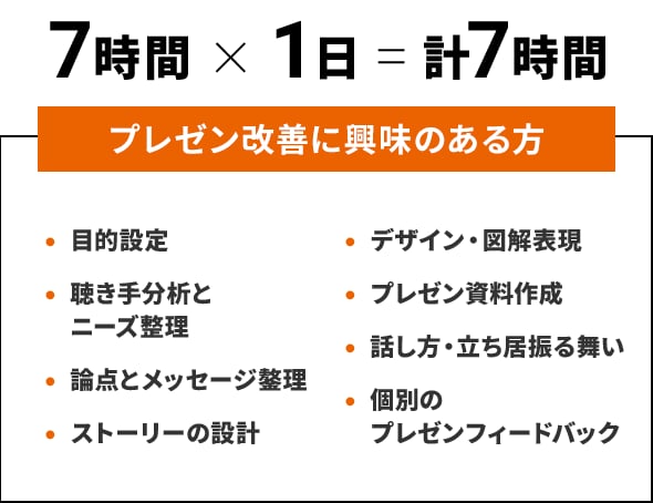 聞き手分析・論点整理・ストーリー設計・資料作成・話し方までを一気通貫で習得。